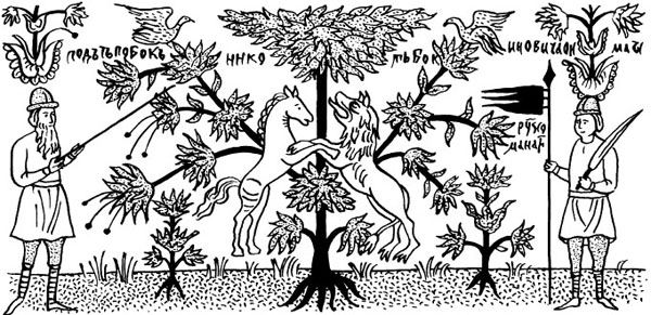 Славяне считали, что на любое небо можно попасть, взобравшись по Мировому Древу, которое связывает между собой Нижний Мир, Землю и все девять небес. Отзвуки этого мифа дошли до нас, например, в сказках о чудесном горохе, выросшем до самой Луны. По мысли древних славян, Мировое Древо всего больше похоже на громадный раскидистый дуб. Однако на этом дубе зреют не одни жёлуди, но также семена всех других деревьев и трав. А там, где вершина Мирового Древа поднимается над седьмым небом, в «хлябях небесных» есть остров, и на том острове живут прародители всех птиц и зверей: «старший» олень, «старший» волк и так далее. Их называли ещё «старыми»: в прежние времена слово «старый» совсем не обязательно означало «дряхлый» и «преклонный годами», как ныне; основным его смыслом было «крепкий», «зрелый», «матёрый». В былинах постоянно встречается выражение: «старый казак Илья Муромец». Имеется в виду его телесная мощь, а вовсе не старость, как иногда думается нам.
