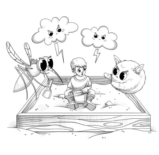 Когда с нами случается стрессовая ситуация, первое, что мы ощущаем, – это боль. Например, нас толкнули или обозвали. Если мы в солнышке, мы сможем отреагировать легко или понять, что это не про нас, а про человека, которому сейчас плохо. Из солнышка можно ответить: «Мне так неприятно, мне это не нравится!» Или можно просто пойти дальше, поняв, что с этим человеком лучше не связываться, но с нами-то все хорошо! Если же мы «выпали» из солнышка, то нам больно («я слабый», «я никчемный, поэтому со мной так можно», «я правда дурак», «мир меня не любит»). Боль чувствовать невыносимо. Чаще всего это наша расщепленная часть, плохая для нас же самих, и мы ее вытесняем. Поэтому, когда что-то случается, мы как бы перескакиваем через боль и сразу начинаем чувствовать страх. Повышается уровень тревоги и напряжения. Если это не почувствовать, не распознать, то мы попадаем в следующее чувство – печаль, затем ощущаем обиду, расстраиваемся, можем застрять в тревоге или пойти дальше – почувствовать гнев. Чем сильнее мы гневаемся, тем больше была боль. Чтобы снять гнев, нужно убрать боль, вернуть себя в солнышко. Если это не происходит с ребенком, он замораживается, потухает. Или живет в вечной тревоге и страхах. Потому что вся эта туча невыраженных и непережитых чувств не пролилась, а значит, не исчезла и продолжает закрывать солнышко. Эта туча – агрессия, направленная на себя. И солнышко гаснет или не так ярко светит, как могло бы. Если ребенок может ответить обидчику, сказать, что ему обидно, заплакать, рассердиться на него, сообщить родителям, что ему было страшно, и попросить о помощи, то мы, родители, можем буквально развести эти тучи руками. Обнимая, помогая решить конфликтную ситуацию, повторяя, что с ним, ребенком, все хорошо, показывая, что он ценный и любимый, а с этой ситуацией в следующий раз можно поступить так или так, мы рассеиваем тучу. Ребенок получает новый опыт, ощущение поддержки, понимание и осознание своей силы и умений. Если же получилось иначе, все чувства блокируются, невыраженный гнев превращается в ярость, страх, ужас и вытесняется в подсознание. Ребенок будет испытывать постоянную тревогу и страх, не понимая, почему.