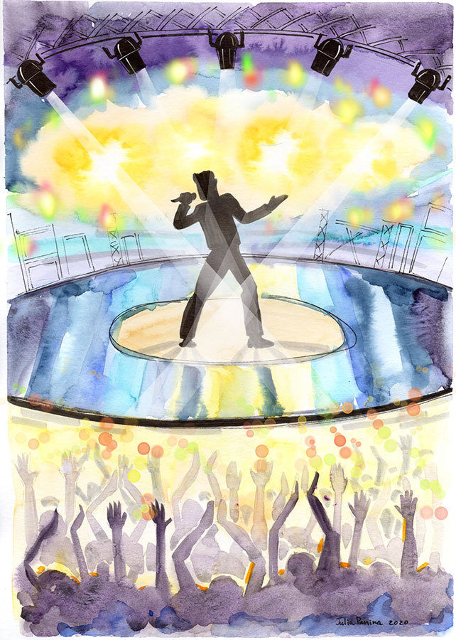 Шоу начинается. Сотни пар глаз устремлены в одну точку. Все застывают в ожидании. В свете ярко белых огней появляется Он.