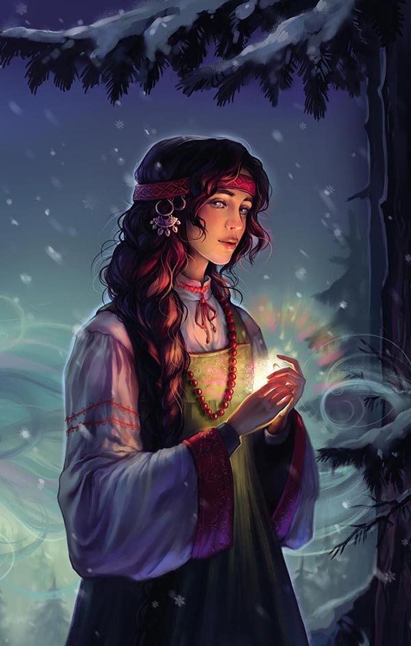 Поэтому юная мастерица всегда внимательно рассматривала работу, но как-то раз ее посетили смутные сомнения. Она пыталась вышить птиц, цветы и круги оберегов, но у нее непроизвольно получилось нечто иное. Птицы напоминали сказочных животных без четкой формы и названия. И еще в голове она снова услышала неясный зов, как тогда, у проруби. Вышивка ожила для нее новыми образами, на миг словно наяву блеснули два оранжевых огонька. Сделалось страшно.