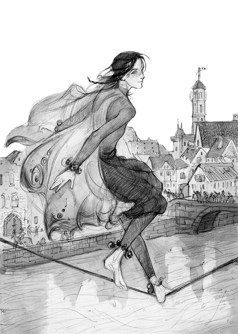 Лежать неподвижно, не крутить финты, не считать было счастьем. Канатная плясунья нежилась до тех пор, пока солнце не поднялось над городской стеной. Сначала по крыше разлилось приятное тепло, потом стало жарко. Тогда она, завернувшись в одеяло, вяло сползла прямо на козлы по нарочно протянутой Бенедиктом верёвке и нырнула в повозку одеваться. Нарядов у неё было три: трико и короткая юбка для работы, старые, латаные-перелатаные юбка и кофта для дороги и, наконец, настоящее платье для города. Новое, почти неношеное, цвету, как сказал Бенедикт, немаркого, фасона скромного. С длинными узкими рукавами, с рядом пуговиц до самого подбородка. Летом в нем было жарко, зимой холодно, но зато все приличия были соблюдены.
