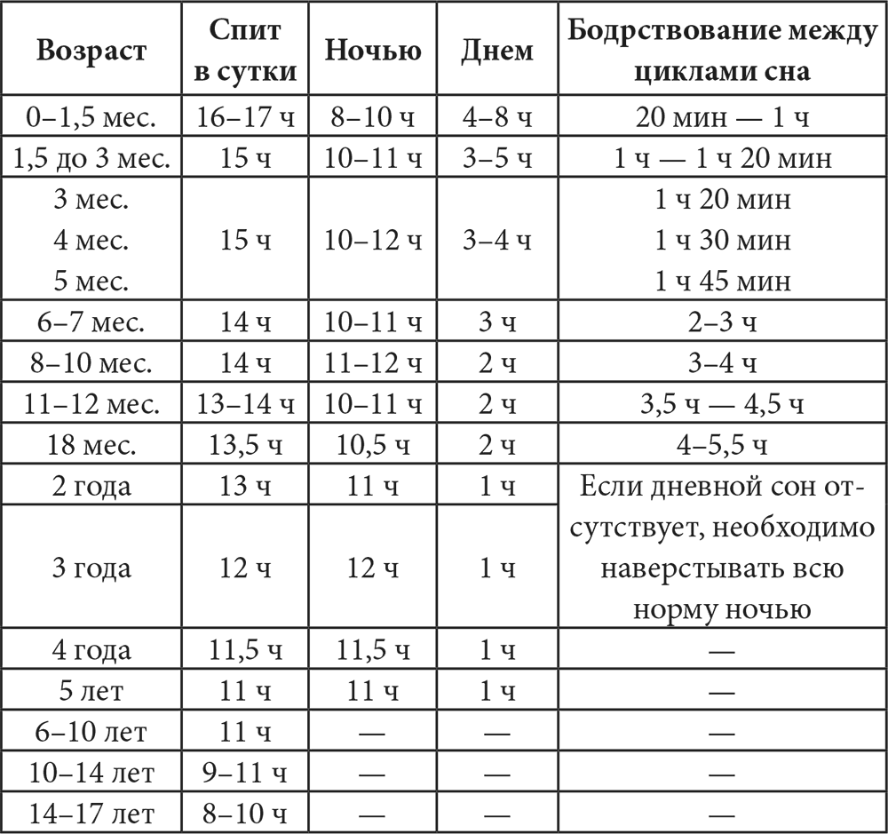 Самой важной колонкой для первого года жизни в этой таблице является длительность циклов бодрствования. Известно, что новорожденные дети до 3 месяцев имеют очень короткие циклы бодрствования, и за эти циклы маме важно успеть и переодеть, и покормить грудью, и поиграть с малышом. Тогда мама заметит и не пропустит первые признаки усталости малыша и вовремя укачает его. Своевременный сон младенца – это залог его здорового развития. Даже если мама забудет о том, что время спать, плач ребенка ей напомнит об этом. Сверившись с таблицей, мама поймет, что причина в усталости ребенка, и не будет его дальше кормить и, таким образом, перекармливать. А хорошее пищеварение – залог отсутствия коликов в первые 3–4 месяца жизни. Также в этот период ребенок постепенно отвыкает находиться в сжатом положении плода, а потому ему все еще спокойнее спится слегка запеленутым. Так рефлекторные движения рук и ног не будят его во сне. Это объясняет, почему дети сладко и крепко спят полностью погруженными в слинг на груди мамы, чувствуя биение ее сердца и звуки, исходящие из живота.