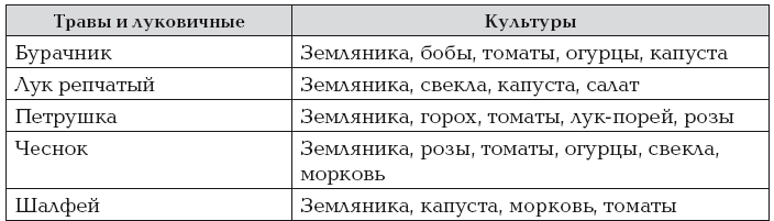 Таблица 1. Совместимость трав и луковичных с клубникой и другими огородными культурами
