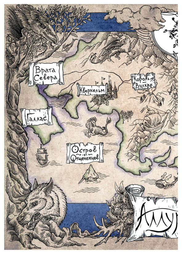 В воцарившейся тишине Гроулис взял две небольшие книги, которые тоже выпали из сумки. Первая разворачивалась в большую карту Аллурии со всеми самыми мелкими деревеньками и даже лагерями Срединных. Она была искусно проиллюстрирована – миниатюры на ее полях показывали города, диковинных зверей, населявших страну, аборигенов в их традиционных нарядах, и прочее. Остров Отщепенцев был здесь же, недалеко от Аллурии и Галласа в Болтливом море, а рядом с ним пририсовали маленького гиппокампа.