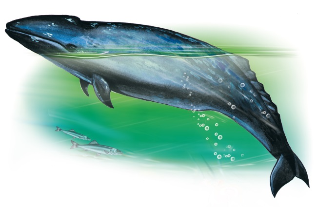 Отряд: китообразные. Длина 14–15 м, масса колеблется от 20 до 35 тонн. Питается планктоном, захватывая в рот огромную массу воды и процеживая ее через особые пластины – «китовые усы», – заменяющие ему зубы. Рождается один китенок длиной около пяти метров и массой до 800 кг. Встречается в Тихом океане, Беринговом, Чукотском, Охотском морях.