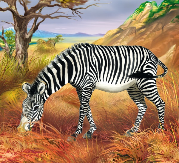 Отряд: непарнокопытные. Длина достигает 2–2,4 м, хвост с удлиненными волосами на конце, масса – до 350 кг. Стада зебр кочуют по саваннам, часто совместно с антилопами. Одиночные зебры пасутся возле жирафов – так безопаснее. От врагов защищаются зубами, ударами передних и задних копыт. Основной враг в природе – лев. В питании преобладают злаки, саванные кустарники. Рождается один жеребенок; через 15 минут после рождения встает на ноги. Населяет африканские саванны и пустыни, горные склоны.
