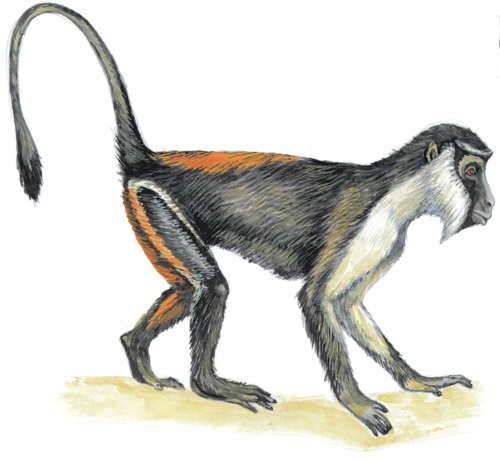 Отряд: приматы. Известен 21 вид мартышек; мартышка обыкновенная имеет массу до шести кг, длину тела – до 45 см, хвост – до 100 см. Питается листьями, молодыми побегами, плодами. Обитают мартышки в дождевых и горных лесах стадами по 40–50 животных. В потомстве один детеныш. Распространены в Африке.