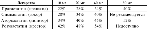 Наука прогнозировала, что к концу XXI в. с инфарктами будет покончено. Очевидно, это предсказание не сбудется, но эти препараты невероятно полезны. Сегодня в Соединенных Штатах продаются восемь статинов. Хотя все эти лекарства существенно снижают уровень «плохого» холестерина, они значительно отличаются по эффективности. В следующей таблице показаны наиболее часто используемые статины и типичные эффекты снижения ЛПНП, которых можно ожидать при различных дозах.