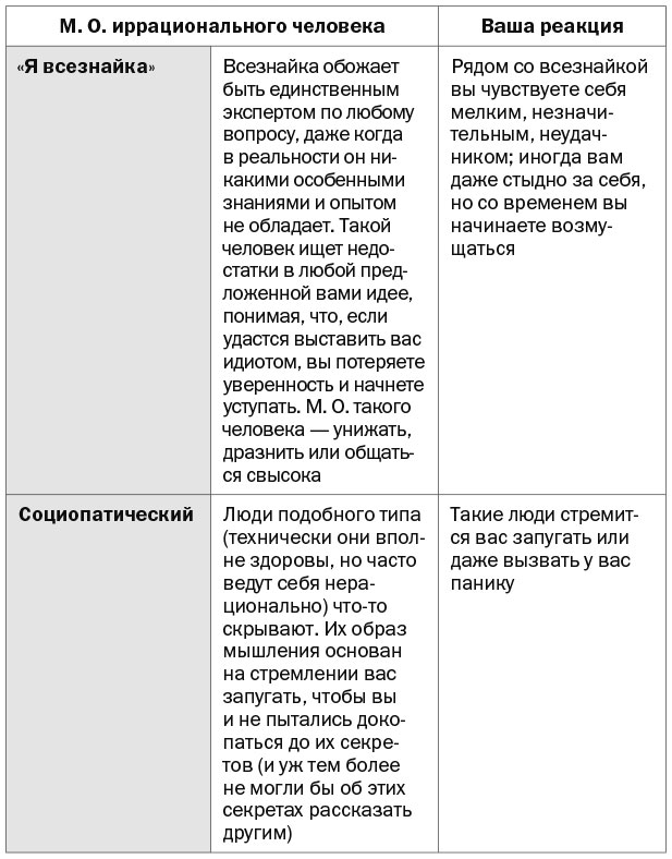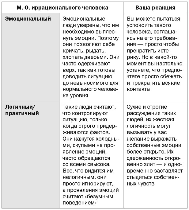 Разобравшись с тем, какого именно типа М. О. использует иррациональная личность, вам будет проще осознать, что все эти истерики, холодность, нытье, замкнутость или агрессия не имеют особого отношения лично к вам: подобным поведением ваш визави пытается восстановить ощущение контроля над ситуацией. Как мы скоро увидим, понимание типа М. О. помогает выбрать наиболее разумную линию поведения.