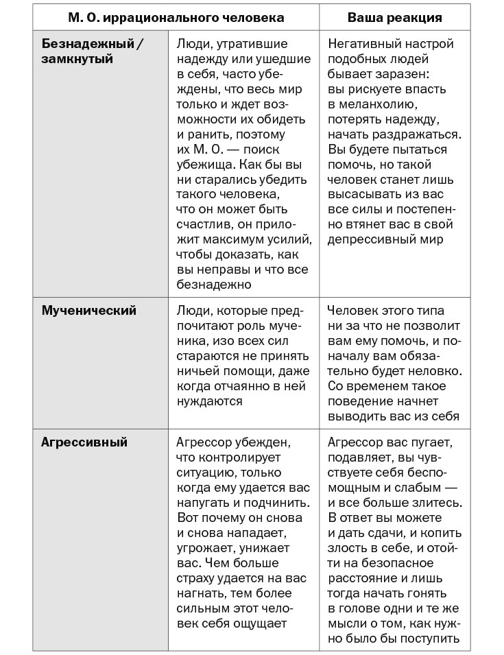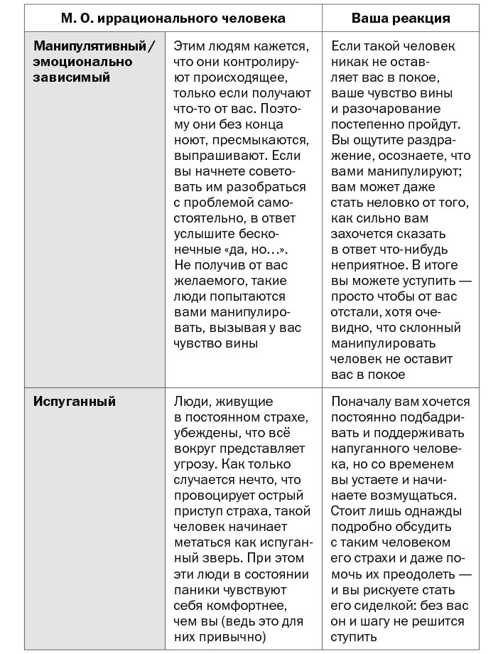 М. О. иррационального человека – это его оружие. Но одновременно это и самая слабая точка, ведь, разобравшись, в чем заключается суть его М. О., вы сможете выгодно использовать эту информацию. Поведение человека, завязшего в определенном М. О., предсказуемо, и вы всегда знаете, к какой реакции с его стороны готовиться, будь то слезы, истерика, молчание, агрессия. А когда вы готовы, вам гораздо проще контролировать собственные эмоции.