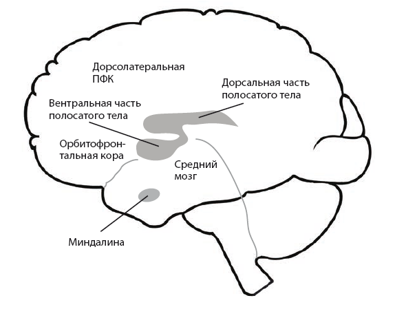 И последнее, что хотелось бы сказать: один и тот же основной механизм формирования привычки – изменение и стабилизация синаптических сетей – работает по-разному в различных участках мозга. Например, эмоциональная сторона формирования привычки связана с изменениями в миндалине и в функционально связанной с ней орбитофронтальной коре лобных долей мозга; новые паттерны действий укрепляются в моторных зонах мозга, включая регионы, которые планируют действия и которые выполняют их; новые привычки мышления связаны с изменениями верхних отделов префронтальной коры; а появление новых источников влечения и желания, а именно это является центральным моментом в формировании зависимости, обусловлено изменениями в полосатом теле и примыкающих к нему участках.