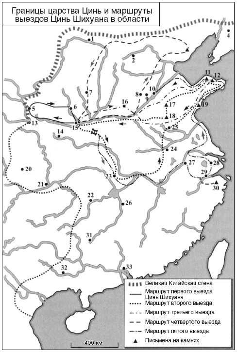 1 — Цзююань; 2 — Дай; 3 — Цзеши; 4 — Ляодун; 5 – Лунси; 6 — Бейди; 7 – Шан; 8 — Ханьдань; 9 — Шацю; 10 — Пиньюань; 11 — гора Чжифу; 12 — Дунгуань; 13 — Линьтао; 14 — Ханьчжун; 15 — Сяньян; 16 — Шандан; 17 — гора Тай; 18 — гора И; 19 — уступ Ланья; 20 – Шу; 21 — Ба; 22 — Цяньчжун; 23 — Цзянлин; 24 — Цзюцзян; 25 – Пэнчэн; 26 — Чанша; 27 — Даньян; 28 — У; 29 — Цяньтан; 30 — гора Гуйцзи; 31 — Гуйлинь; 32 — Сян; 33 — Наньхай