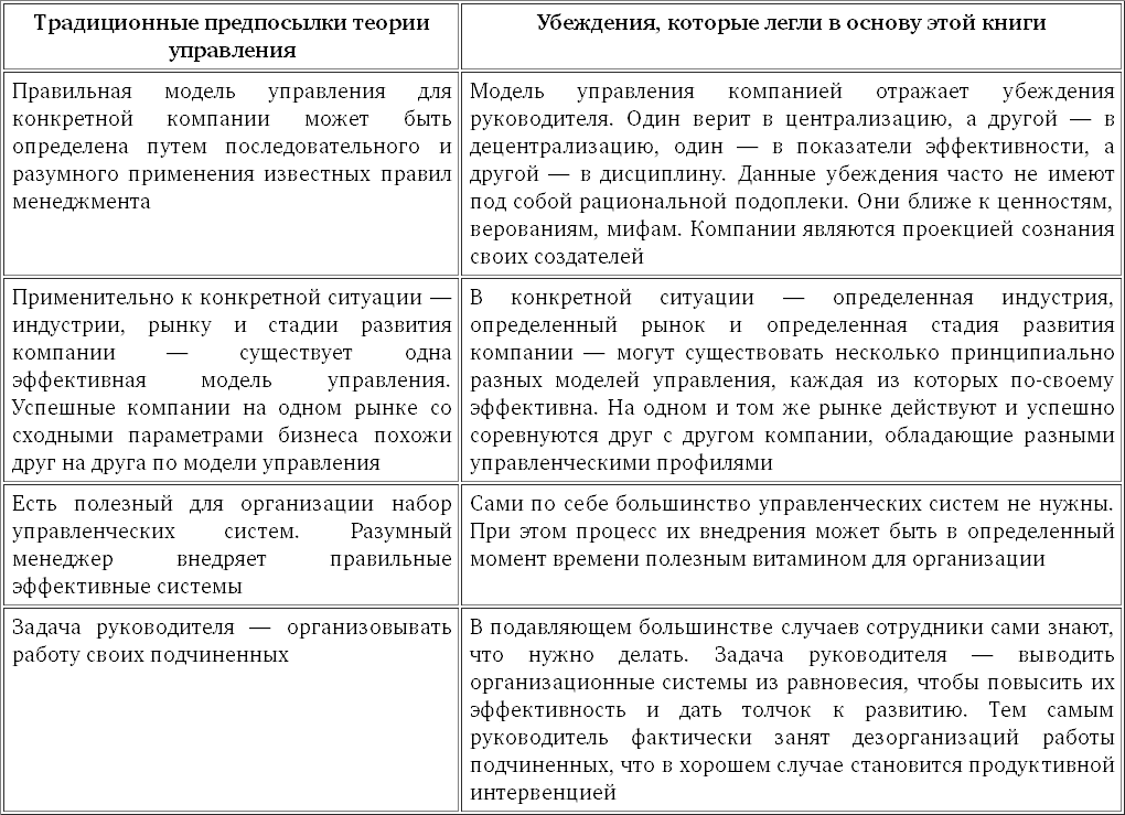 Попробую обобщить традиционные предпосылки, составляющие фундамент традиционной теории управления, и сравнить их с моими убеждениями, которые легли в основу этой книги.