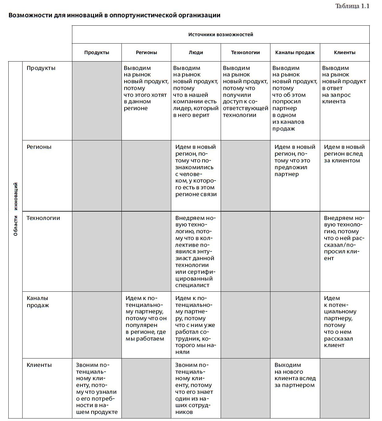 Важнейший принцип оппортунизма – видеть возможности во всем, что происходит вокруг. В табл. 1.1 приведены причины, которые могут служить основанием для тех или иных инновационных ходов оппортунистической организации.