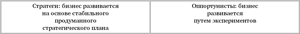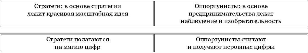 Сравнивая два подхода, важно осознавать, что бывают хорошие и плохие стратеги, а также хорошие и плохие оппортунисты. Более того: бывают плохие бизнесмены, которые не являются ни тем, ни другим. И поэтому не хочется, чтобы плохое, бессистемное, глупое ведение бизнеса прикрывалось оппортунистическим подходом. Есть плохой бизнес – а есть успешный эффективный оппортунизм.