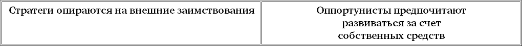 Оппортунисты исповедуют патриархальную «местечковую» идеологию: не влезать в кредиты. Их денежный поток положителен. В результате инвестиционных проектов намного меньше, сами инвестиции скромнее, но зато выше независимость и устойчивость к кризисам.