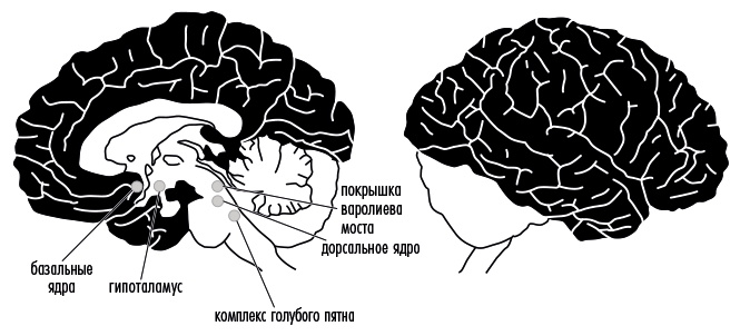 Рис. 1. Слева – вид головного мозга в медиальном разрезе (посредине), справа – вид мозга сбоку. На рисунке показаны кора мозга (черным) и ствол (белым). Отмечены только те ядра ствола, которые считаются важными для управления быстрым сном, а именно покрышка моста, дорсальное ядро шва и комплекс голубого пятна. Показано также местоположение базальных ядер в переднем мозге (под корой) и гипоталамуса, о значении которых мы поговорим позже