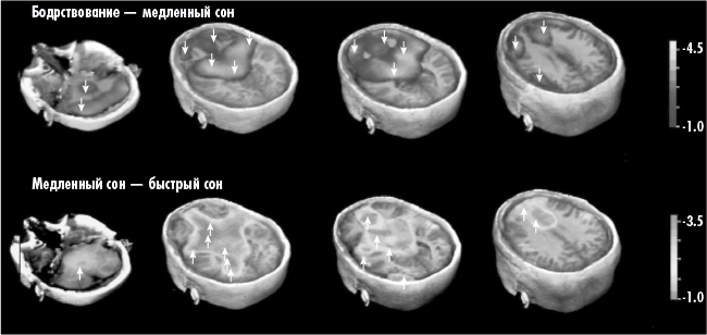 Рис. 3. В горизонтальных рядах (слева направо) представлены срезы мозга от нижней части к верхней. В верхнем ряду показаны различия между бодрствующим и спящим мозгом: выделенная темным область демонстрирует понижение активности коры при засыпании; в нижнем ряду – различие между быстрым и медленным сном: выделенная светлым область соответствует повышению подкорковой активности в начале фазы быстрого сна. Наибольшая активность наблюдается там, где расположена ПОИСКОВАЯ система