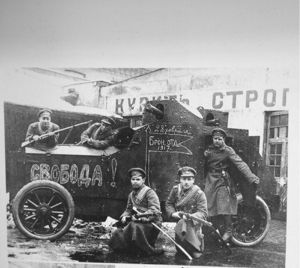 Воинственные позы солдат и демонстрация ими оружия как будто бы решительно заявляли, что свобода зависит от тех, кому принадлежит право насилия. Солдат у дверцы, с кинжалом на поясе, целится пистолетом в объектив. Бойцы на переднем плане, припавшие к земле под стволом пулемета, вооружены и готовы к бою. Эту сцену можно интерпретировать и как сюжет о мужчинах и мужественности. Хотя революцию начали женщины, отважно вышедшие на петроградские улицы в конце февраля, мотивом этого снимка служат храбрость и бдительность вооруженных мужчин. Но не все на нем настолько однозначно. В то время как один из бойцов, пристроившихся над словом «Свобода!», держит в руке пистолет и свирепо глядит на нас, другой выглядит расслабленным и слегка улыбается. А на стене гаража позади броневика написаны слова «Курить строго запрещено». Они попали в кадр чисто случайно, представляя собой просто деталь интерьера на оружейном складе. Но, может быть, не будет слишком большой вольностью увидеть в них символ: примечание, указывающее на сохранение власти и правил среди горючих материалов, напоминание о необходимости поставить свободе какие-то пределы.