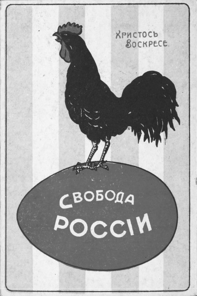 На рис. 2 петух, над которым помещено традиционное пасхальное приветствие «Христос воскресе», венчает собой зарю – слова «Свобода России», написанные на большом красном пасхальном яйце.