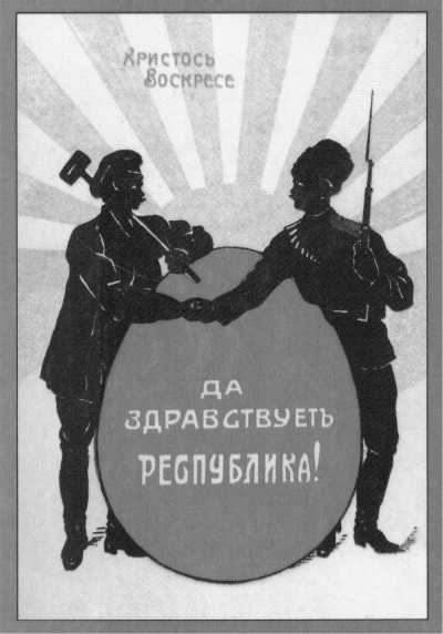 На рис. 3, под тем же приветствием, на фоне восходящего солнца рабочий и солдат обмениваются рукопожатием солидарности над уже совсем огромным пасхальным яйцом с надписью: «Да здравствует республика!» Хотя это выражение смысла свободы путем сочетания светского и священного (а также природы и христианства) может вызвать у нас недоумение, такое отождествление воскресения Христова с возрождением России было абсолютно характерно для того времени.