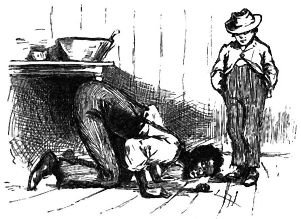 Папаша до того разошелся, что уже не замечал, куда его несут ноги, – а они его не больно-то слушались, так что, наткнувшись на бочонок со свининой, он полетел вверх тормашками, ободрал себе коленки и принялся ругаться на чем свет стоит; больше всего досталось негру и правительству, но, между прочим, и бочонку тоже влетело порядком. Он довольно долго скакал по комнате, сначала на одной ноге, потом на другой, хватаясь то за одну коленку, то за другую, а потом как двинет изо всех сил левой ногой по бочонку! Только это он зря сделал, потому что как раз на этой ноге сапог у него порвался и два пальца торчали наружу; он так взвыл, что у кого угодно волосы встали бы дыбом, повалился наземь и стал кататься по грязному полу, держась за ушибленные пальцы, а ругался он теперь так, что прежняя ругань просто в счет не шла. После он и сам это говорил. Ему приходилось слышать старика Соуберри Хэгана в его лучшие дни, так будто бы он и его перещеголял; но, по-моему, это он уж хватил через край.