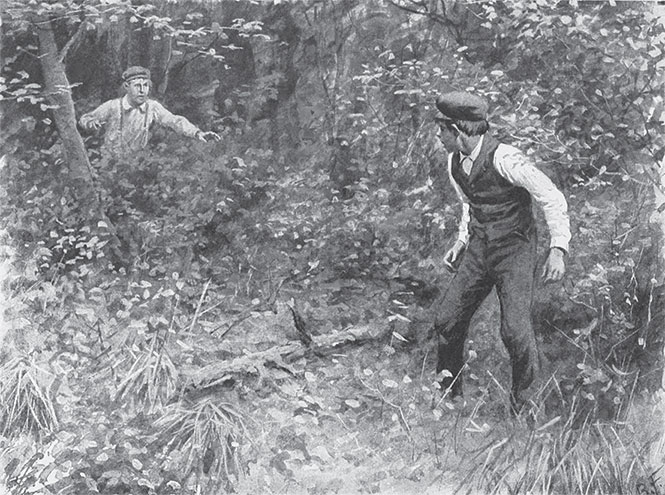 Как только дождь прекратился, мы вышли из дома. Уже настал день, и мы, идя по дороге, встречали то одного, то другого из соседей, с каждым из них останавливались побеседовать, рассказывали о том, когда мы приехали, и как поживает дядя Сайльс, и сколько времени мы думаем прогостить у него, но никто из них не говорил нам ни слова про убийство. Это начинало казаться непонятным. Том сказал, что если бы мы пошли под сикоморы, то, наверное, оказалось бы, что убитый лежит там один-одинешенек и кругом нет ни души. Затем он высказал предположение, что те двое людей загнали убийц так далеко в глубину леса, что злодеи воспользовались случаем и убили своих преследователей, так что теперь некому и сообщить про убийство. Разговаривая таким образом, мы, сами того не замечая, очутились перед сикоморами. Я похолодел от ужаса и не мог сделать ни шагу далее, несмотря на все уговоры Тома. Но Том не мог удержаться; ему необходимо было видеть, надеты ли сапоги на убитом. Осторожно прополз он под деревья, но не прошло и минуты, как вернулся назад с вытаращенными от изумления глазами и прошептал: