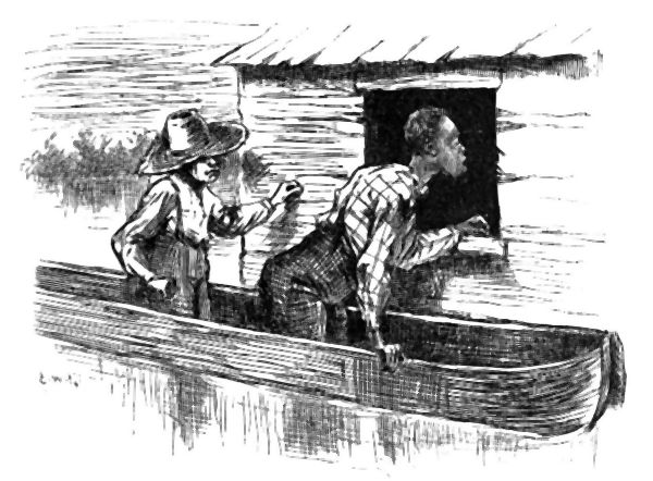 Когда мы поравнялись с нижним концом острова, начало светать. Мы заглянули в окно. Разглядели кровать, стол, два старых стула, и еще на полу валялось много разных вещей, а на стене висела одежда. В дальнем углу лежало что-то вроде человека. Джим окликнул:
