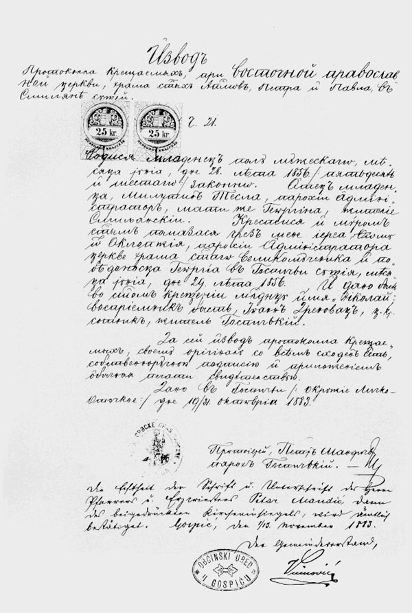 Согласно семейному преданию, предки Николы носили фамилию Драганич, а Теслами их прозвали за крупные передние зубы, напоминающие тесло – плотницкий топор с поперечно расположенным лезвием. Отец Николы, Милутин Тесла, поначалу, следуя семейной традиции, хотел стать военным, но во время учебы в офицерской школе передумал. Некоторое время он занимался журналистикой, а затем принял постриг и стал священником.[4] Это не очень понравилось отцу Милутина, деду и тезке нашего героя, доблестно сражавшемуся в рядах наполеоновской армии, но сын настоял на своем точно так же, как в свое время настоит на своем Никола, которого отец хотел видеть священником.