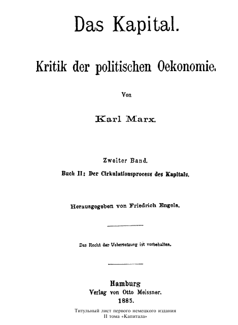 Подготовить к печати вторую книгу «Капитала» и притом так, чтобы она представляла собой, с одной стороны, связное и по возможности законченное произведение, а с другой стороны, произведение исключительно автора, а не редактора, – это было нелёгкой работой. Многочисленность подвергавшихся переработке рукописей» носивших в большинстве случаев отрывочный характер, затрудняла задачу. Лишь одна-единственная рукопись (рукопись IV) – в той части, которая включена в книгу – была вполне подготовлена для печати, однако бо́льшая часть и этой рукописи оказалась устаревшей в результате позднейших переработок. Главная масса материала, хотя и была большей частью обработана по существу, но не отделана стилистически, материал изложен таким языком, каким Маркс обыкновенно составлял свои выписки: небрежный стиль, фамильярные, часто грубо-юмористические выражения и обороты, английские и французские технические названия, часто целые фразы и даже страницы по-английски, это – запись мыслей в той форме, в какой они в том или ином случае развивались в голове автора. Наряду с отдельными, обстоятельно изложенными частями, другие, не менее важные, только намечены, фактический материал для иллюстраций собран, но едва сгруппирован, не говоря уже об обработке. В конце главы, стремясь быстрее перейти к следующей, Маркс часто ставил лишь несколько отрывочных фраз, намечающих развитие мысли, оставленное здесь незаконченным, наконец, известный почерк, разобрать который иной раз не мог сам автор.