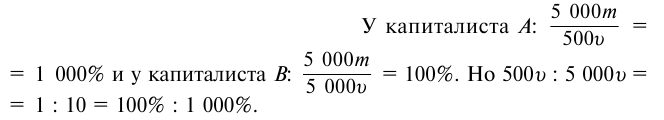 Во второй пятинедельный период у капиталиста A, как и у капиталиста B, потребляется новая рабочая сила, и для оплаты этой рабочей силы расходуется новый капитал в 500 ф. ст. Жизненные средства рабочих, купленные на первые 500 ф. ст., потреблены, во всяком случае их стоимость исчезла из рук капиталиста. На вторые 500 ф. ст. покупается новая рабочая сила, новые жизненные средства извлекаются с рынка. Короче говоря, расходуется новый капитал в 500 ф. ст., а не старый. Но у капиталиста A этот новый капитал в 500 ф. ст. представляет собой денежную форму вновь произведённой стоимости, возмещающей ранее израсходованные 500 ф. ст. У капиталиста B эта возмещающая стоимость находится в такой форме, в которой она не может функционировать как переменный капитал. Она имеется налицо, но не в форме переменного капитала. Поэтому для продолжения процесса производства в следующие пять недель должен быть в наличии и должен быть авансирован добавочный капитал в 500 ф. ст. в неизбежной для данного случая денежной форме. Таким образом в течение 50 недель как капиталист A, так и капиталист B расходуют одинаковый по размерам переменный капитал, оплачивают и потребляют одинаковое количество рабочей силы. Но капиталист B должен оплатить её, авансировав капитал, равный всей её стоимости = 5 000 ф. ст., тогда как капиталист A оплачивает её последовательно стоимостью, постоянно возобновляемой в денежной форме, производимой в течение каждых пяти недель и возмещающей капитал в 500 ф. ст., авансируемый на каждые 5 недель. Следовательно, капиталист A никогда не авансирует денежный капитал более чем на 5 недель, т. е. никогда не авансирует капитал больший, чем капитал в 500 ф. ст., авансированный на первые пять недель. Этих 500 ф. ст. достаточно на весь год. Поэтому ясно, что при одинаковой степени эксплуатации труда, при одинаковой действительной норме прибавочной стоимости годовые нормы прибавочной стоимости у капиталистов A и B должны находиться в обратном отношении к величинам тех переменных денежных капиталов, которые им необходимо было авансировать для того, чтобы в течение года привести в движение одинаковую массу рабочей силы.