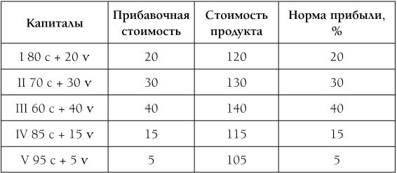 Возьмем пять различных отраслей производства с различным органическим составом вложенных в них капиталов (предполагая, что рабочая сила во всех случаях приносит в качестве прибавочной стоимости 100 % своей собственной стоимости).