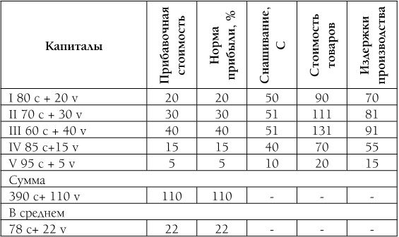 Общая сумма капиталов, вложенных в пяти отраслях, равна 500; общая сумма произведенной ими прибавочной стоимости равна 110; общая стоимость произведенных ими товаров равна 610. Рассмотрим 500 как один-единственный капитал, по отношению к которому подразделения І-Ѵ являются только отдельными частями (как, например, это происходит в хлопчатобумажной фабрике, в различных подразделениях которой – чесальне, подготовительной мастерской, прядильне, ткацкой мастерской – существует различное отношение между постоянным и беременным капиталом, и среднее отношение для всей фабрики получается только путем вычисления). В этом случае средний состав капитала 500 был бы = 390 с + 110 ѵ, или в процентах 78 с + 22 ѵ. Каждый из капиталов в 100, рассматриваемый лишь как 1/5 всего капитала, имел бы своим составом этот средний состав 78 с + 22 ѵ; равным образом на каждые 100 приходилось бы 22 в качестве средней прибавочной стоимости; поэтому средняя норма прибыли была бы равна 22 % и, наконец, цена каждой пятой части всего продукта, произведенного капиталом 500, равнялась бы 122. Продукт каждой пятой части всего авансированного капитала должен был бы, таким образом, продаваться за 122.