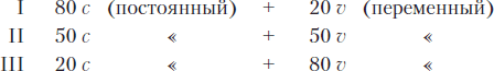 Так как прибыль исчисляется в виде процентного отношения излишка ко всему процентному капиталу, то это означает прибыль в 20, 50 и 80 %.