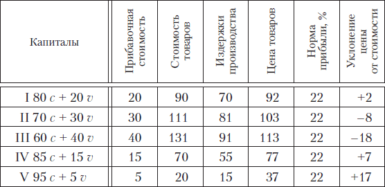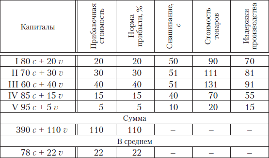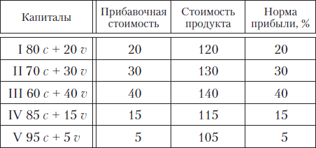 Возьмем пять различных отраслей производства с различным органическим составом вложенных в них капиталов (предполагая, что рабочая сила во всех случаях приносит в качестве прибавочной стоимости 100 % своей собственной стоимости).