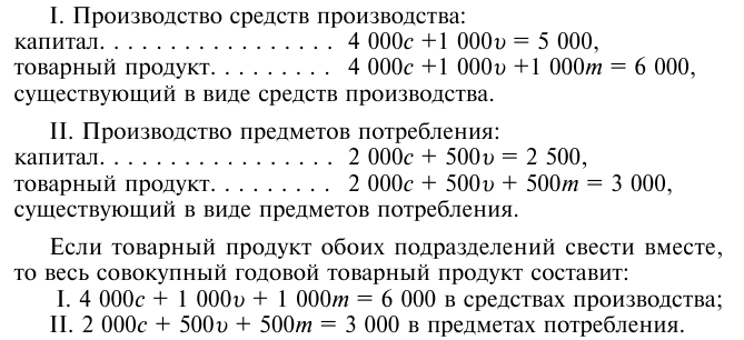 Стоимость всего годового продукта, произведённого в каждом из двух подразделений с помощью этого переменного и постоянного капитала, распадается на часть стоимости, представляющую постоянный капитал c, потреблённый в процессе производства и по своей стоимости лишь перенесённый на продукт, и на часть стоимости, присоединённую к продукту всем трудом в течение года. Эта последняя часть стоимости годового продукта, в свою очередь, распадается на возмещение авансированного переменного капитала v и на избыток над ним, образующий прибавочную стоимость m. Следовательно, подобно стоимости всякого отдельного товара, стоимость всего годового продукта в каждом подразделении тоже распадается на с + v + m.