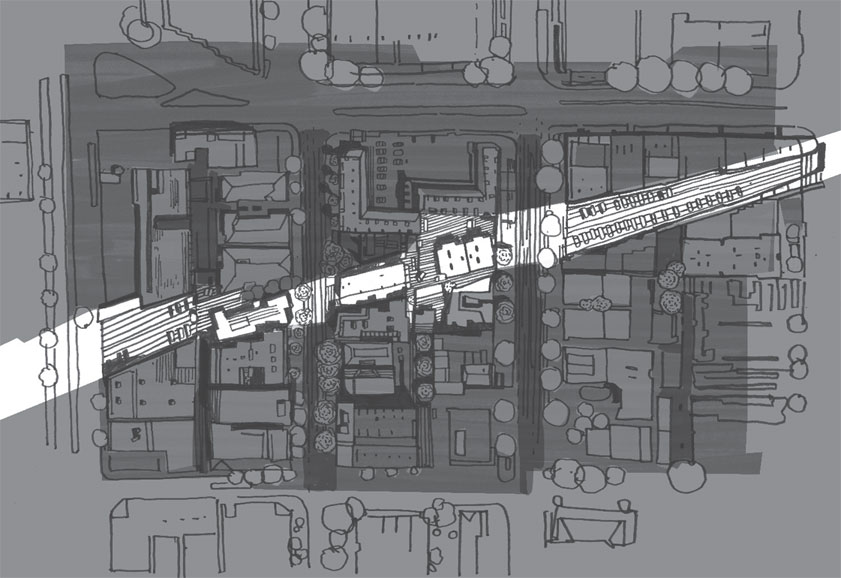 Когда дороги и рельсы исчезают, остаются пустоты. Иногда они заполняются новыми зданиями, форма которых подстраивается под очертания забытых улиц и проездов. В результате появляется своего рода архитектурный шрам, рубцовая ткань – словно застройка залечивала старые раны. На уровне улиц это может быть не так заметно: возможно, у отдельных зданий будет необычный угол здесь или искривленная сторона там. Но при взгляде сверху можно увидеть более явные узоры, покрывающие целые кварталы или даже районы. Такие шрамы особенно заметны на фоне общепринятых схем планирования городской уличной сети.