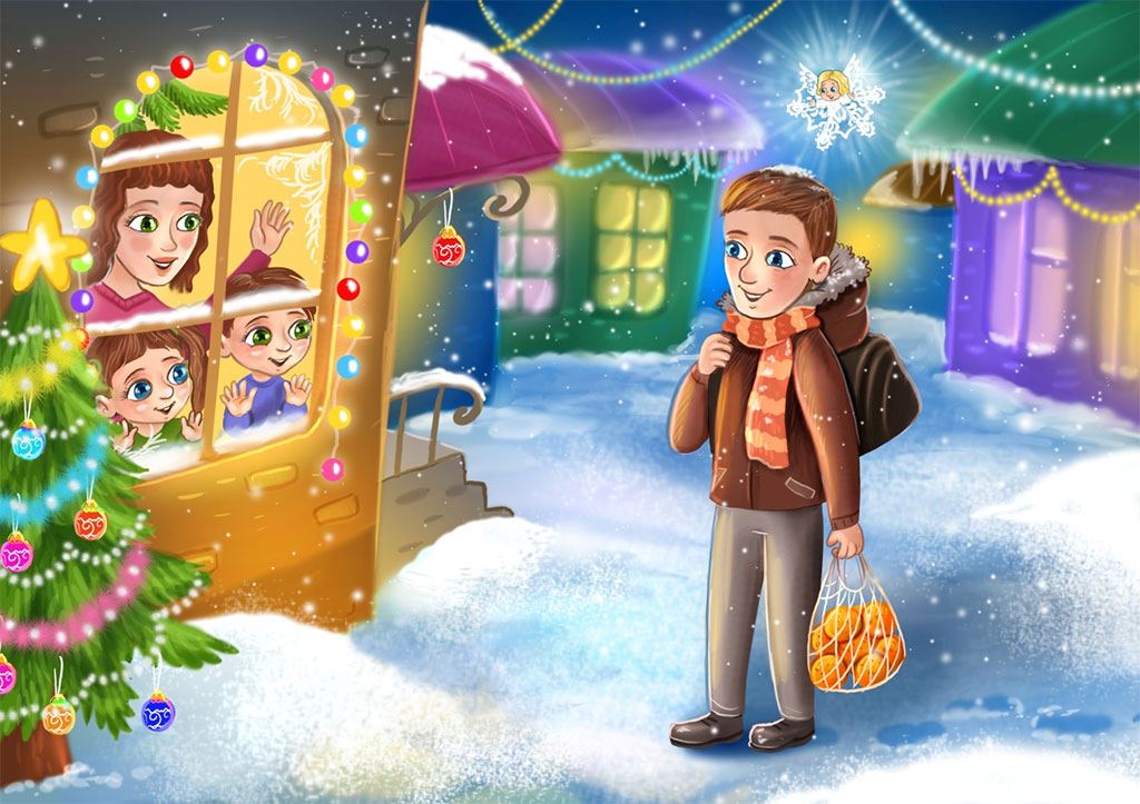 Однажды под Рождество Андрей уехал в дальнюю командировку, и у него не получалось вернуться домой вовремя, это его сильно опечалило: его семья всегда в этот день дома. Они вместе радовались, катались счастливые со снежных горок, играли в снежки, строили снеговика, украшали праздничную ёлочку, а потом вместе ужинали разные вкусности, которые сами готовили.