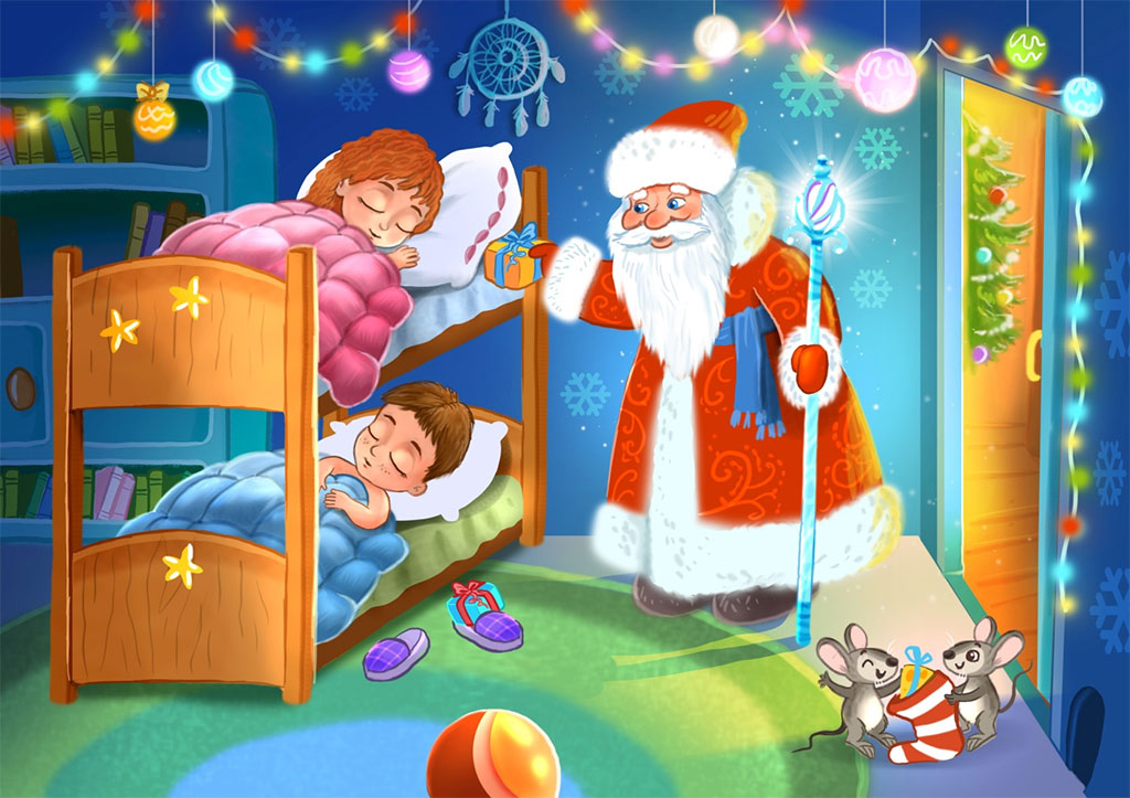 В первую очередь он приходит в дом к хорошим детям, которые весь год старательно учатся, помогают своим родителям, бабушкам и дедушкам, и так как времени у Деда Мороза мало, если вы вдруг в момент его прихода уже сладко спите, оставляет свои подарки обычно под подушкой, чтобы сны ваши были добрыми и сказочными.