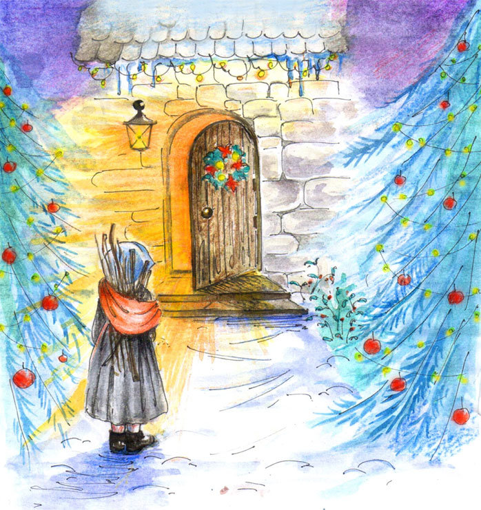 И вот наконец она увидела красивый старинный фонарь, освещающий вход в большой деревянный дом. Снег сразу же прекратился. Девочка поднялась на крыльцо и тихо постучала. К её удивлению, дверь тут же отворилась, как будто её здесь ждали. Симпатичный гномик в красной шапочке улыбнулся, приглашая её войти. Настенька вся дрожала от холода, но, переступив порог, окунулась в мир тепла и уюта.