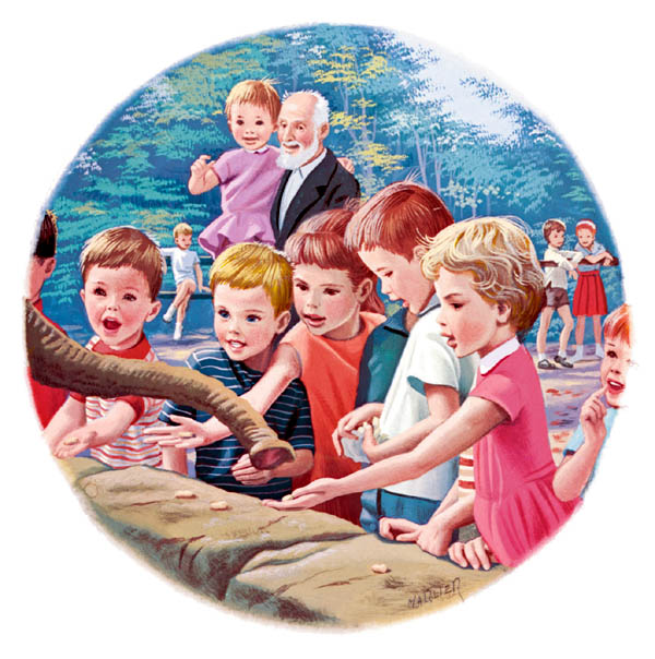 У слонов очень длинный гибкий хобот. Они им могут и ветки с дерева срывать, и лакомства из рук у человека брать. И многие протягивают им хлеб или печенье. Женя тоже хотел угостить Сахарка, но я его удержала: