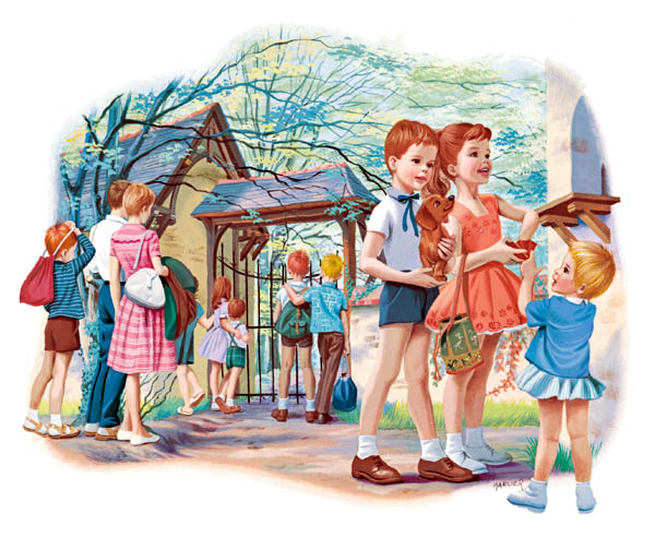 Один нарвал цветов, другой отнял букет у брата и поскорее убежал. Самый старший набрал в горсть орехов и всё время грызёт их.