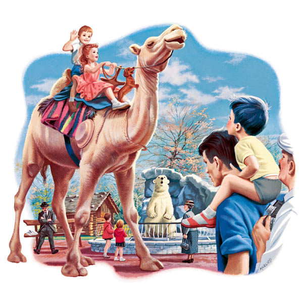 На верблюде можно прокатиться. Он такой сильный, что легко несёт нас всех троих: Женю, меня и Таксика. Переставляет ноги плавно, как танцор. Нам с высоты виден весь зоопарк!