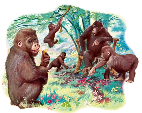 Вот шимпанзе, человекообразная обезьяна. И правда, мама-шимпанзе сидит совсем как человек. Она сердита на своих детей: они такие непослушные!