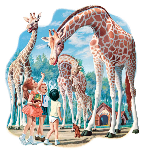 «Вот это звери, – подумал Таксик. – Раскрашены, как будто шкура вся в заплатках. А шея, шея-то! Что, интересно, делать, если понадобится что-нибудь сказать этой громадине на ушко?»