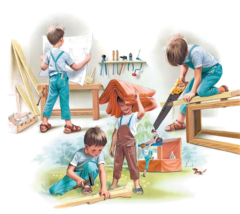 Мой младший брат Филя и его приятель Гоша взялись украсить сад и смастерить палатки для аттракционов.