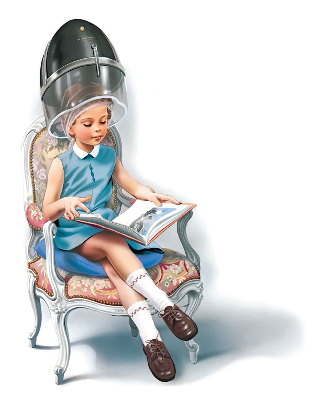 Парикмахерский фен похож на рыцарский шлем. Но сидеть под ним довольно скучно. Хорошо, что я захватила с собой книжку.