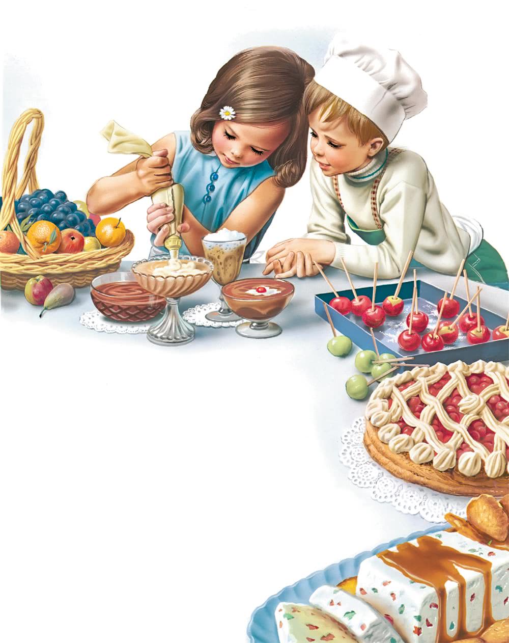 Мы с Филей незаметно сбегали на кухню. Я повязала белый фартук, Филя надел поварской колпак. Мы оба взяли по подносу и понесли гостям.