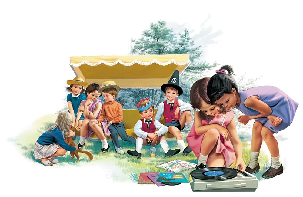 Папа вынес в сад свой старый проигрыватель и целую коллекцию пластинок. Ребята таких никогда и не видели.