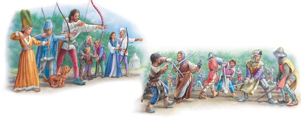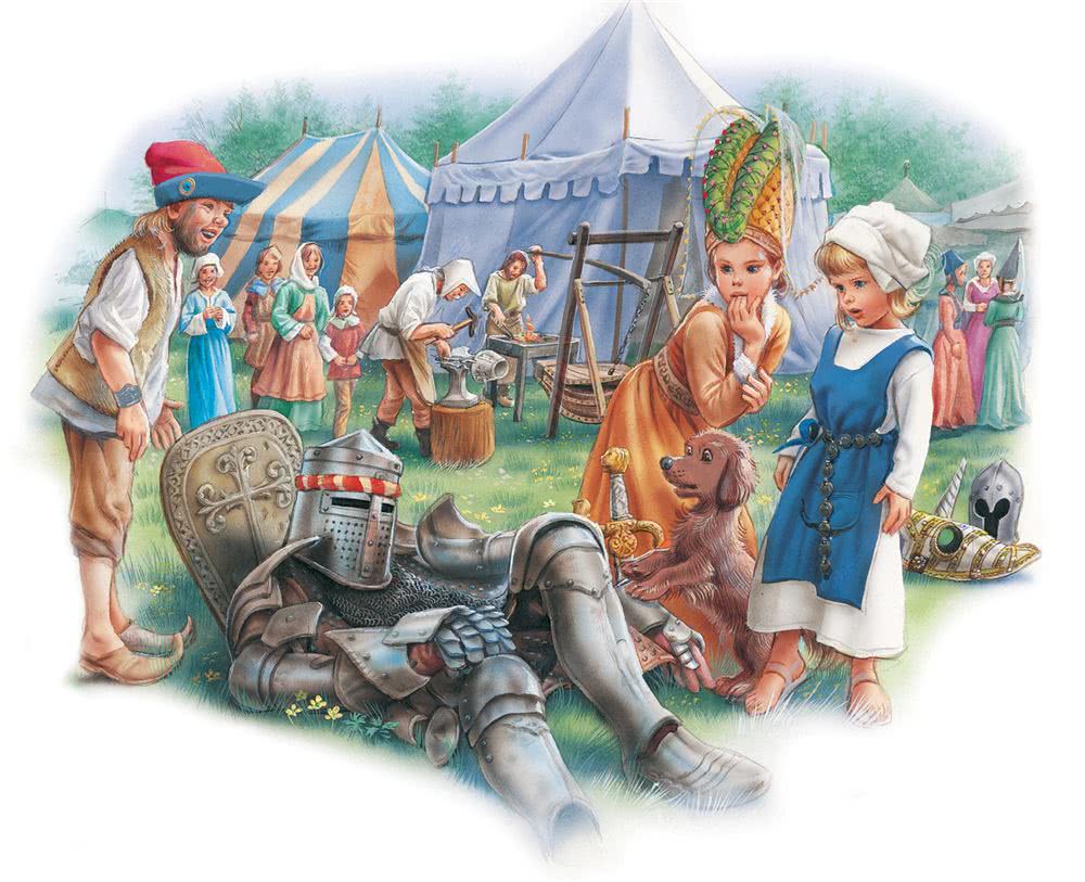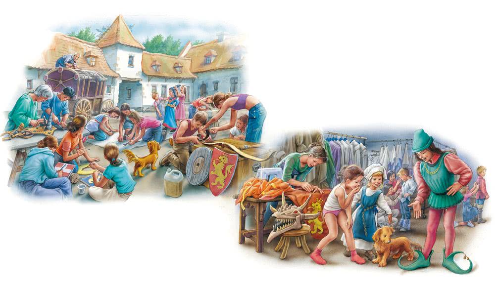 Приготовления идут полным ходом. Дел хватает и взрослым, и детям. Дошивают плащи и платья, докрашивают гербы и щиты. Многие даже поменяли профессию. Мой дедушка, инженер на пенсии, стал каретным мастером, школьный учитель с сыном украшают конскую упряжь, студенты мастерят деревянный лук. А костюмов, костюмов-то сколько надо сшить: для всех жителей, больших и маленьких!
